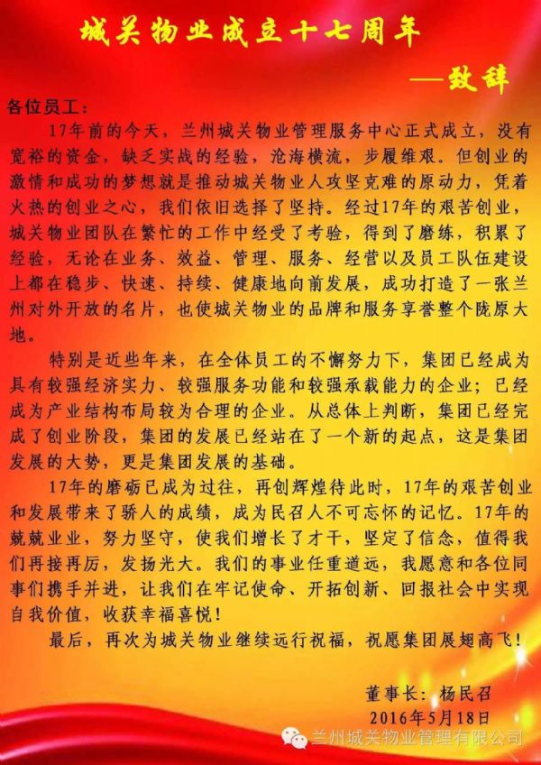 熱烈慶祝城關(guān)物業(yè)管理有限公司成立17周年